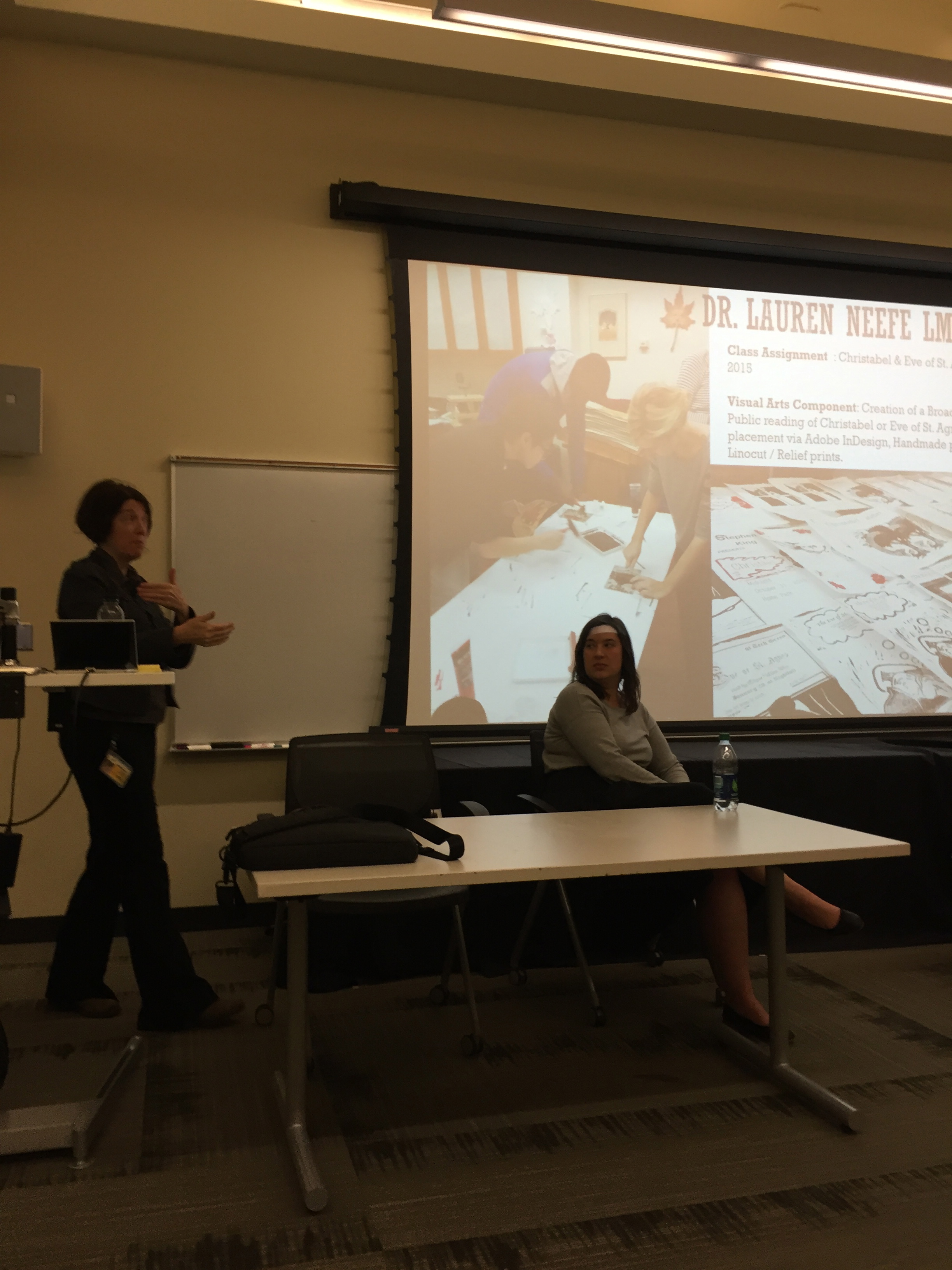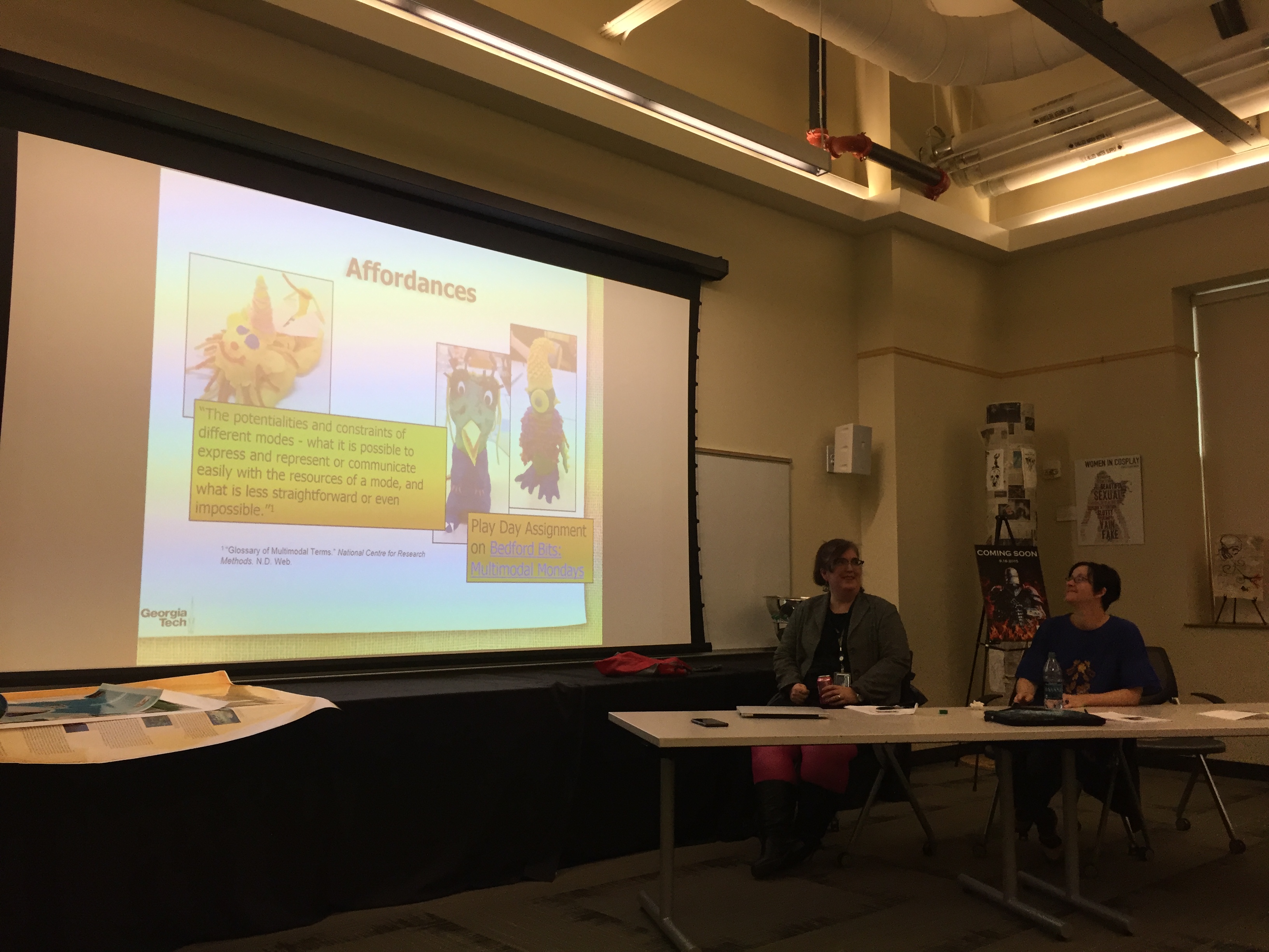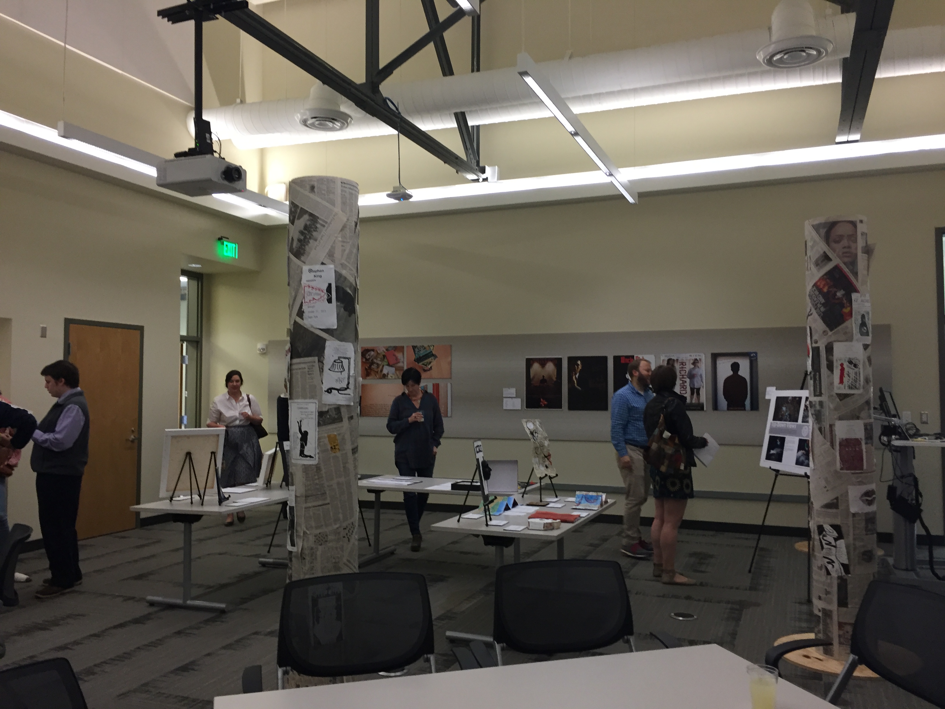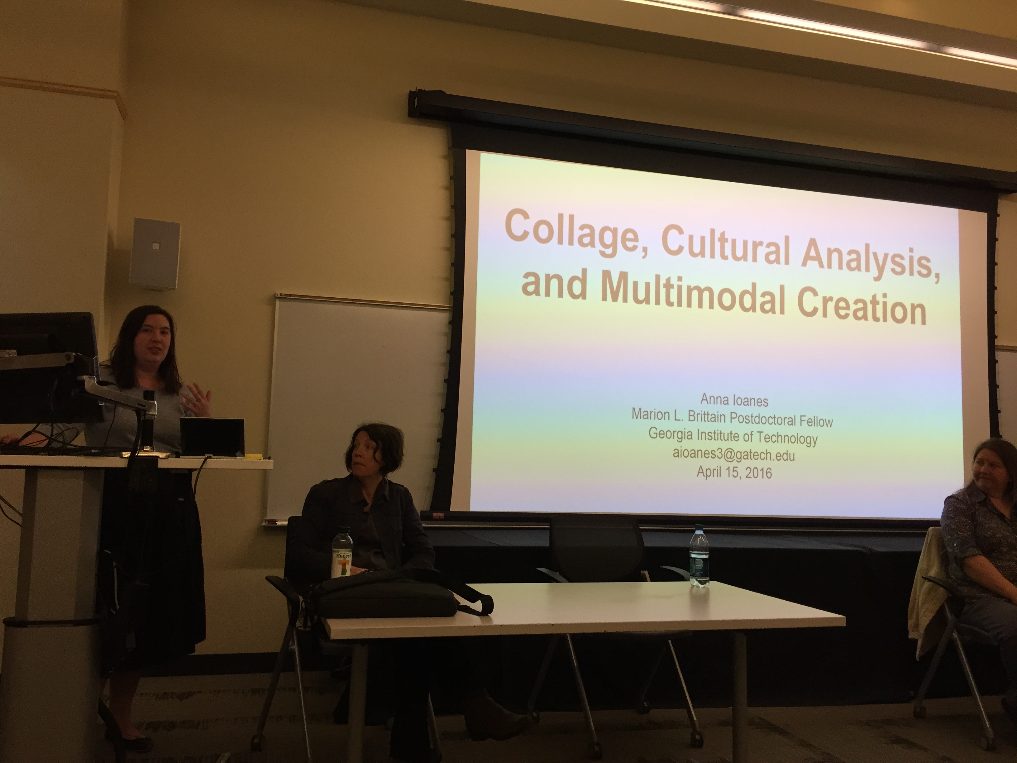 The panels that took place on Friday following the exhibit’s opening reception provided an opportunity for those in attendance to think about art in the classroom as well as across the Georgia Tech community. The first panel, “Integrating the Arts Across Georgia Tech,” featured Brittain Fellows Dr. Lauren Neefe and Dr. Anna Ioanes who have done large-scale collaborative projects in their classrooms. Dr. Neefe, along with her collaborators Virginia Howell, Education Curator at the Robert C. Williams Paper Museum, and Alison Valk, GT Librarian, shared their work on a project entitled “Pulp, Print, Post” in which students made and displayed broadsides for readings of Romantic poetry. Dr. Ioanes and her collaborator, Atlanta artist and GT Artist-In-Residence Mario Petrirena, shared work her students had done with collage. The takeaway? Get students thinking about their relationship to creativity. Approach people about collaborations. Make art visible. Work together.