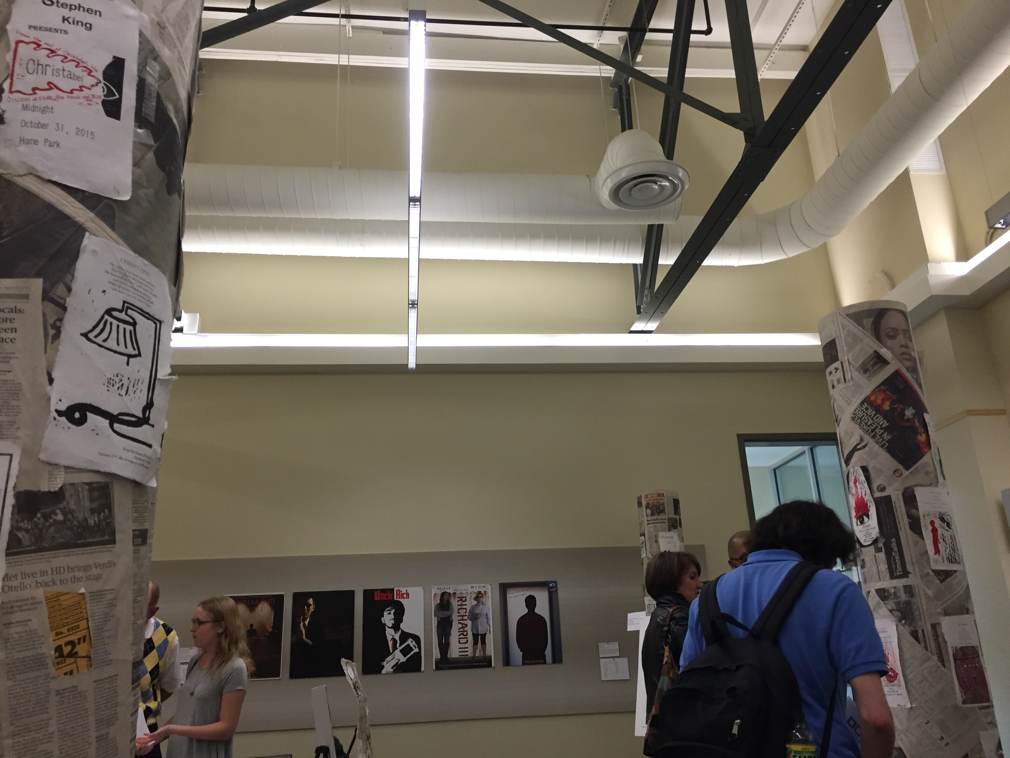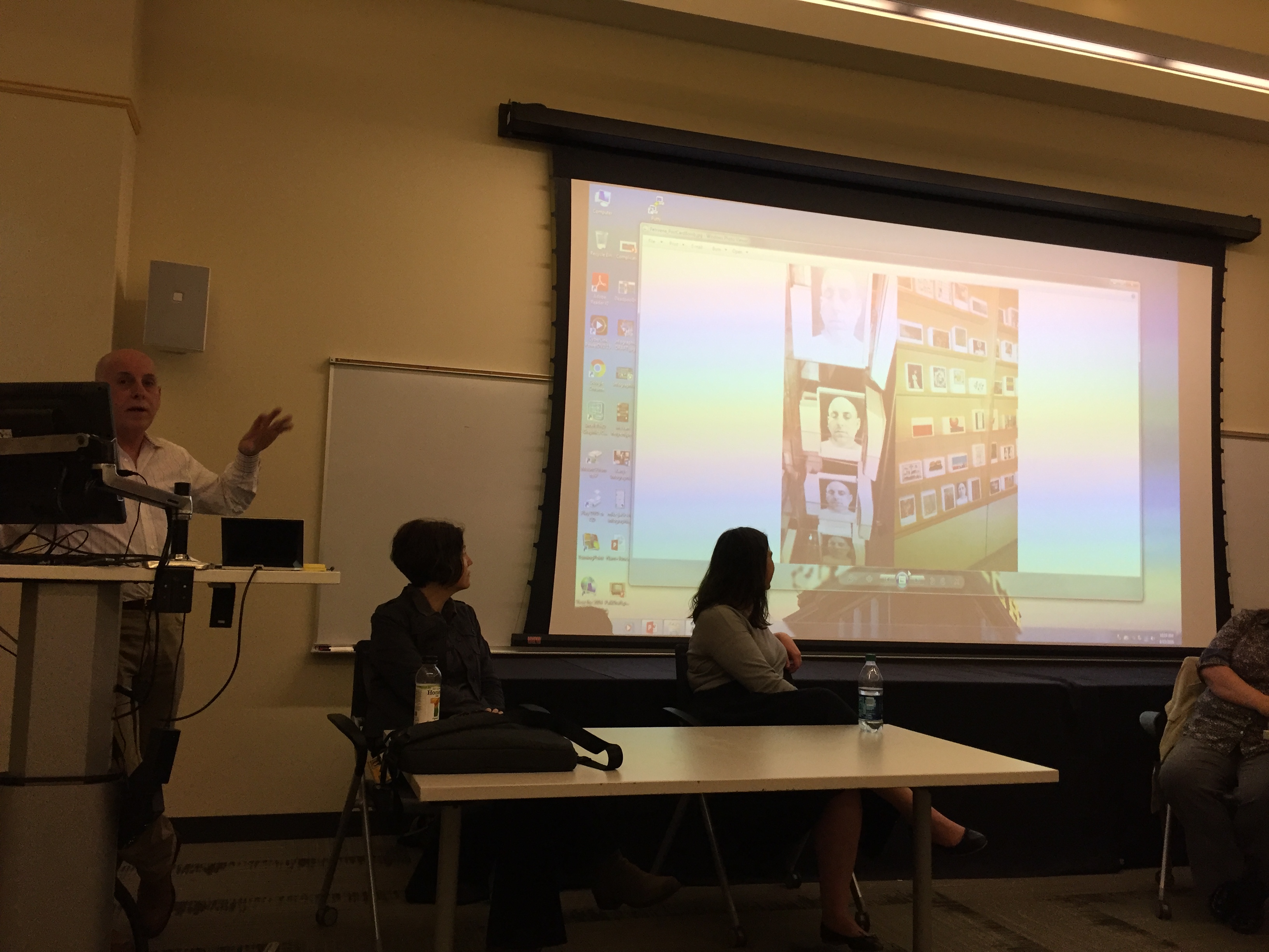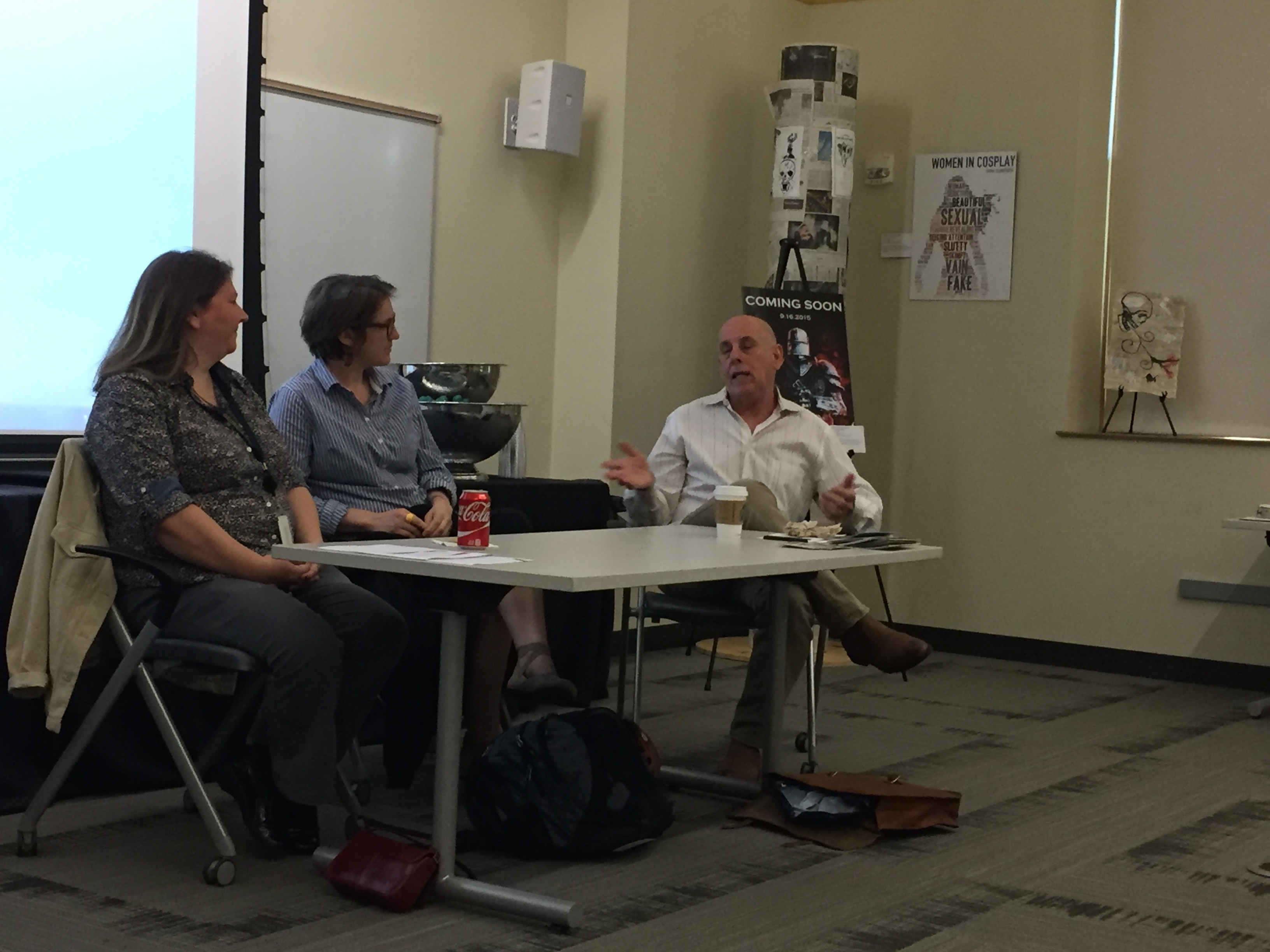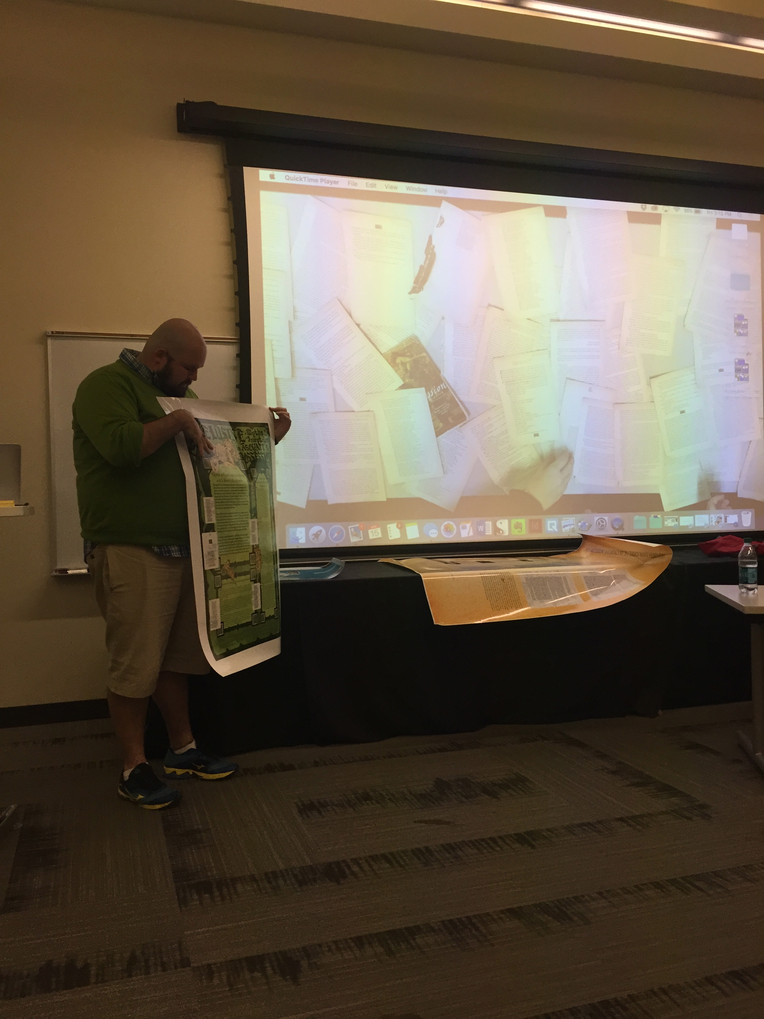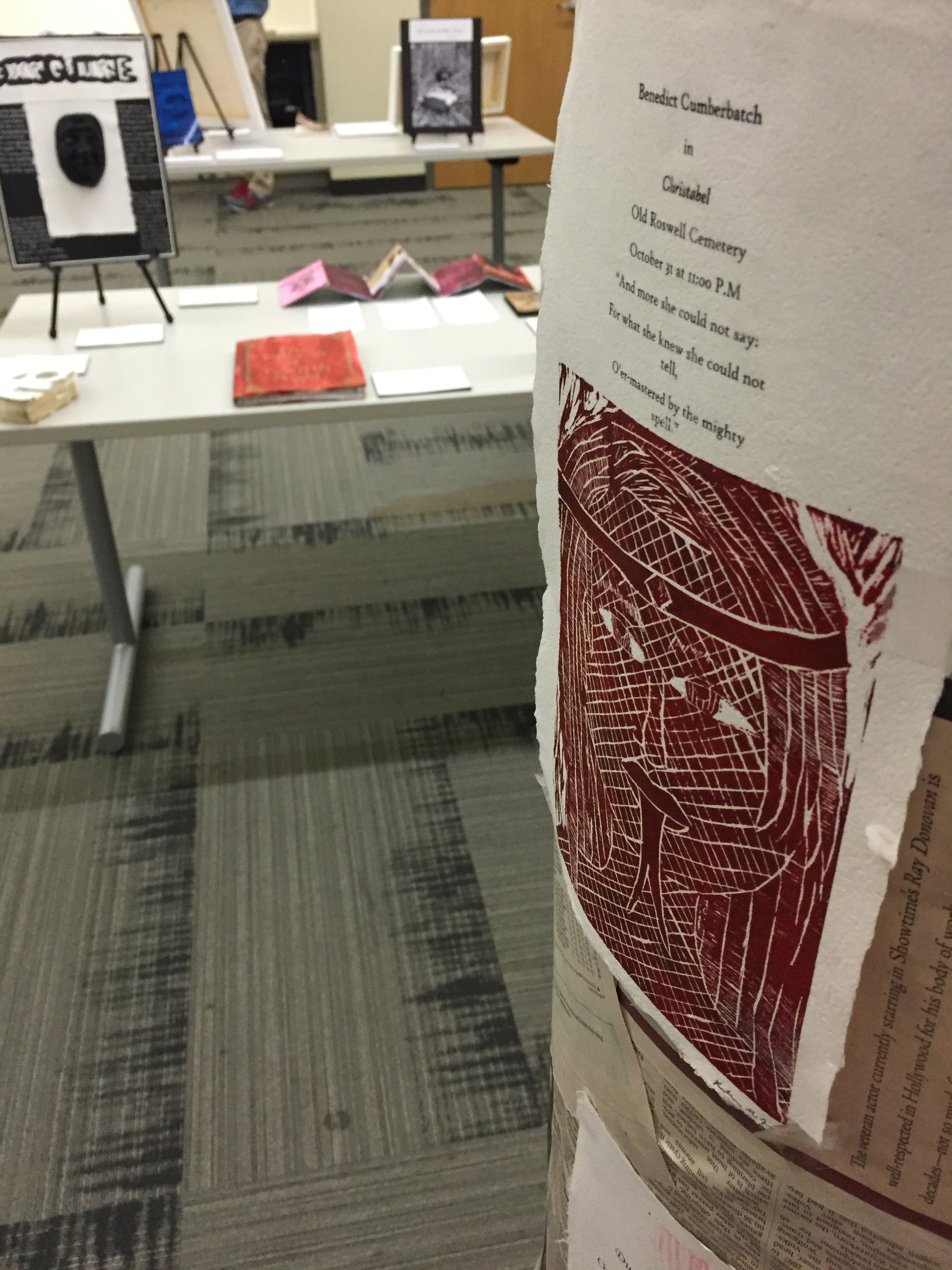 The panels that took place on Friday following the exhibit’s opening reception provided an opportunity for those in attendance to think about art in the classroom as well as across the Georgia Tech community. The first panel, “Integrating the Arts Across Georgia Tech,” featured Brittain Fellows Dr. Lauren Neefe and Dr. Anna Ioanes who have done large-scale collaborative projects in their classrooms. Dr. Neefe, along with her collaborators Virginia Howell, Education Curator at the Robert C. Williams Paper Museum, and Alison Valk, GT Librarian, shared their work on a project entitled “Pulp, Print, Post” in which students made and displayed broadsides for readings of Romantic poetry. Dr. Ioanes and her collaborator, Atlanta artist and GT Artist-In-Residence Mario Petrirena, shared work her students had done with collage. The takeaway? Get students thinking about their relationship to creativity. Approach people about collaborations. Make art visible. Work together.